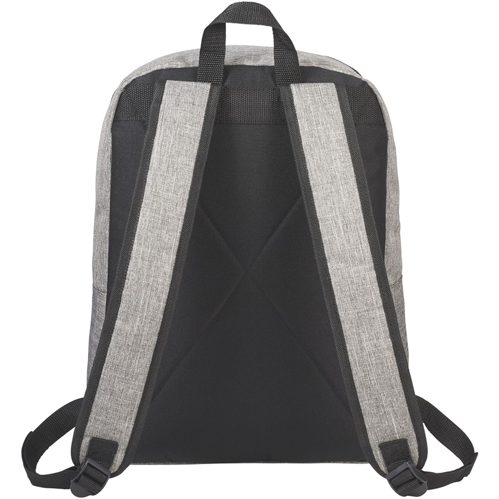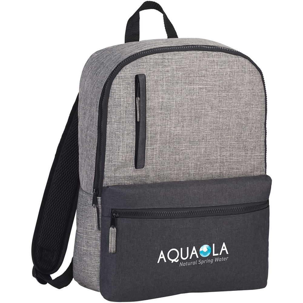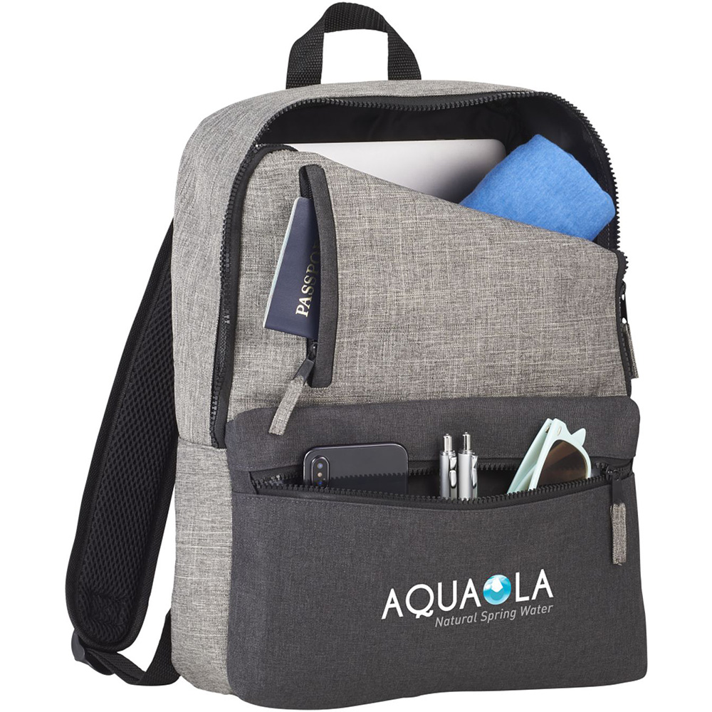 The Reclaim Recycled 15'' Computer Backpack exterior is made from 100% recycled materials, providing a sustainable yet durable bag for your accessories and electronics. It features two zippered front pockets, plus a spacious zippered main compartment containing a 15'' laptop sleeve. A partnership with 1% For The Planet ensures that one percent of your purchase gets donated to nonprofit environmental protection groups. The Reclaim Recycled 15'' Computer Backpack is ideal for commuting, traveling, or regular daily use.. Features. Material: 100% recycled 210D rPET. Main compartment zips shut securely. 2 zippered front pockets for extra storage. 15'' laptop sleeve protects your computer. 1% of sales from your purchase is donated toward nonprofit environmental protection groups. Price includes embroidery.