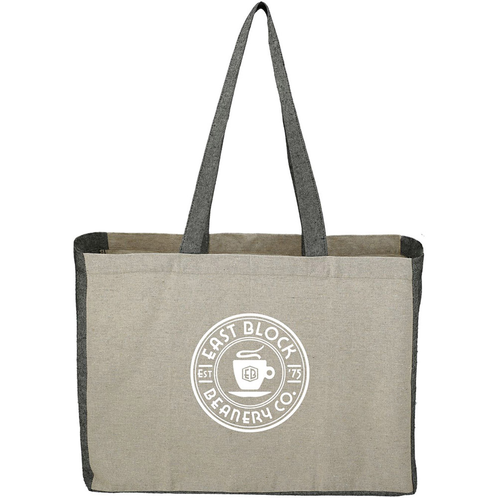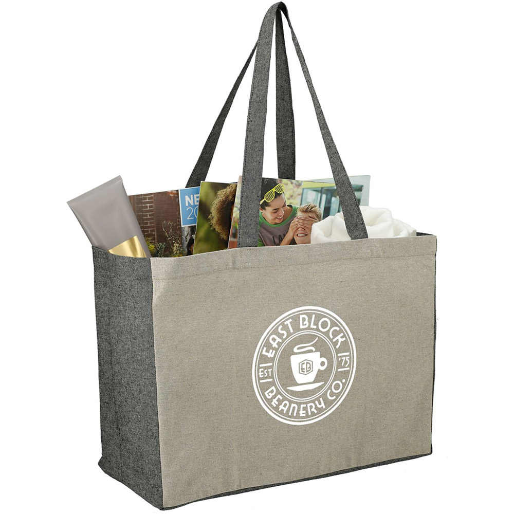 The Recycled Cotton Contrast Side Shopper Tote is made from eco-friendly, pre-consumer recycled cotton and features trendy color-contrasting sides. It features two carry handles, an open main compartment and makes a great alternative to plastic bags. Through a partnership with 1% For The Planet, one percent of sales of all EcoSmart products will be donated to nonprofits dedicated to protecting the planet. Materials: 70%-80% Recycled Cotton.
