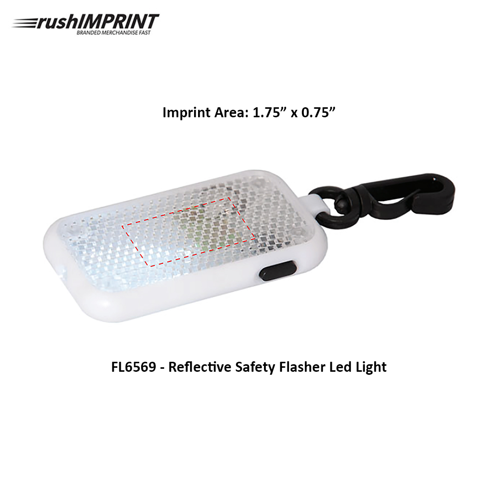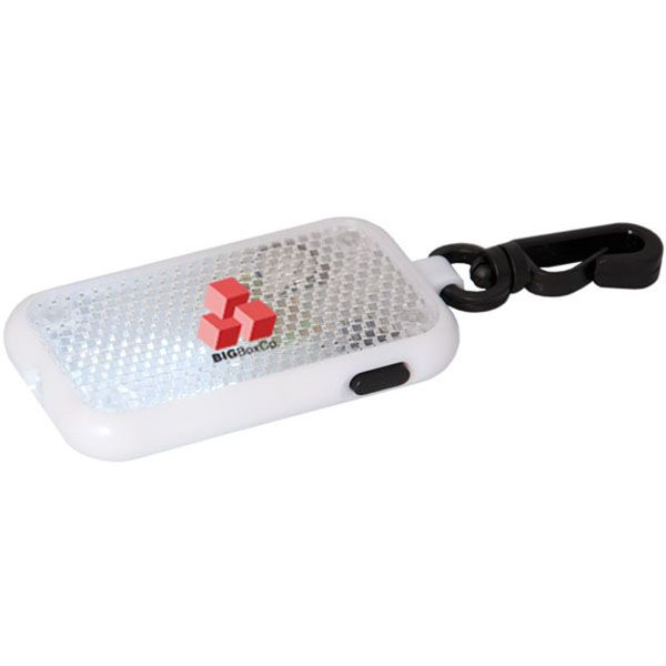 Plastic. Tri-function LED light: strobe light, flash and continuous on. Change at the press of a button. On/off button on side. Battery included/inserted. Clip onto any bag, strap, belt loop or keychain to keep handy. Great for illumination while running or biking after dark. Price includes one colour imprint, one location.