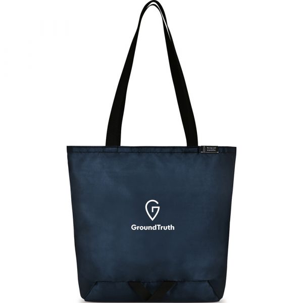 A modern and sustainable update to a packable shopper using recycled fabric and webbing made from plastic bottles. Lightweight and incredibly packable for on-the-go convenience. Elastic detail is used to secure the shopper when packed away. Packed Dimensions: 5.75L 1.5H 3.5W. 25.75" shoulder straps. This product is kid-friendly/CPSIA compliant. Price includes one colour, one location imprint.
