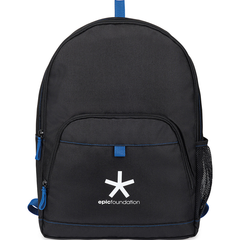 A modern and sustainable update to a classic backpack using recycled fabric and webbing made from plastic bottles. Front zippered pocket with slash pocket. Zippered main compartment for secure storage. Side mesh bottle pocket. Top grab handle with back panel trolley strap. PVC Free Product. Price includes one colour, one location imprint.