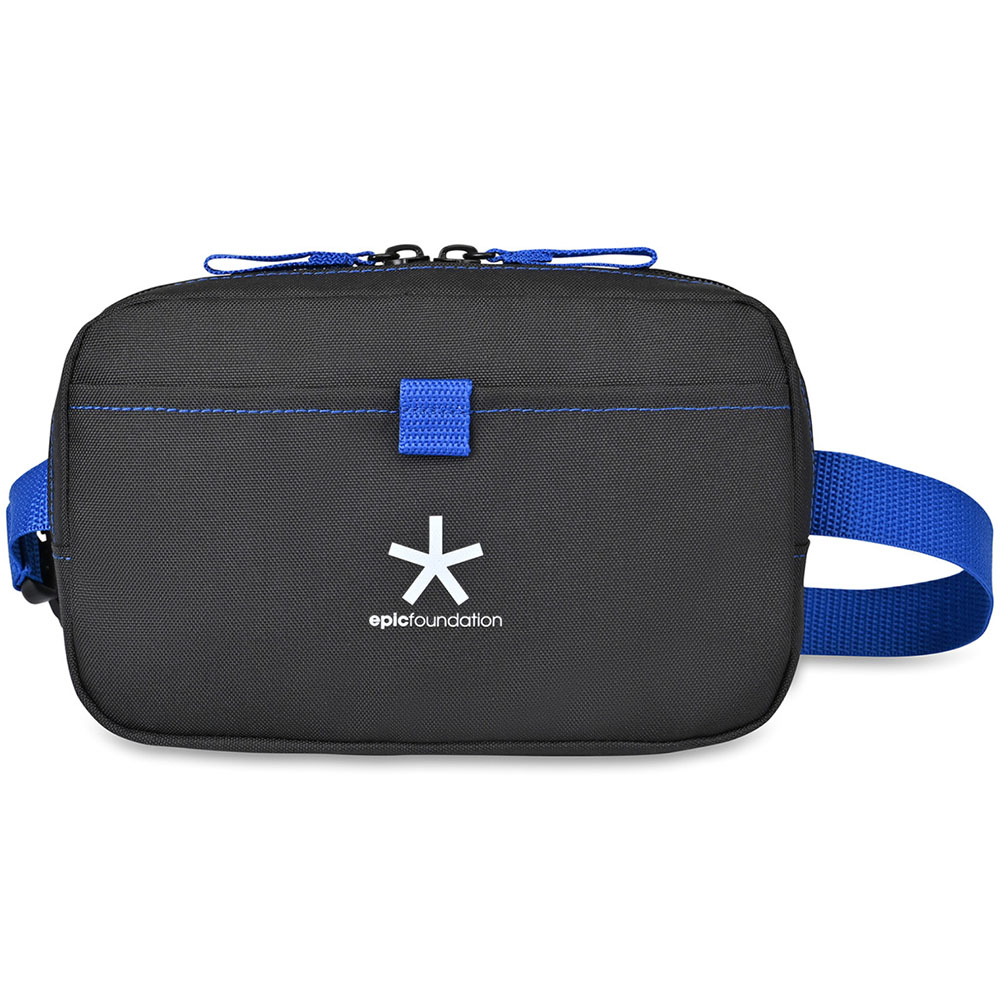 Materials:600 rPET, 210D rPET. A modern and sustainable update to a classic waist pack using recycled fabric and webbing made from plastic bottles. Zippered opening to the main compartment. Front slash pocket. Adjustable waist strap with buckle closure, length adjusts up to 45". PVC Free Product. Price includes one colour, one location imprint.