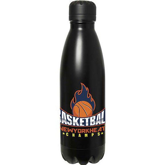 Black matte finish 18/8 Stainless Steel exterior. Inner Copper insulated liner. Keep your beverages cold for up to 24 hours. Double walled vacuum insulation helps prevent condensation from hot or cold beverages. Keep hot beverages hot and cold beverages cold longer. Use for cold water, tea, coffee or your other favourite beverage. Sturdy Stainless Steel construction. Screw on Stainless Steel leak proof lid help avoid spills or leaks. Holds up to 500 ml. (17 oz.). Easy to drink from. BPA free and FDA compliant. Keep on at the office, in your gym bag and in the car. Use on walks, hikes, yoga and the gym. A great eco-friendly substitute to disposable water bottles. Fits in most standard cup holders. Individually retail packaged. Same design as WB9030 Rockit BPM bottle with coloured matte finish lids. Price includes one colour, one location imprint.