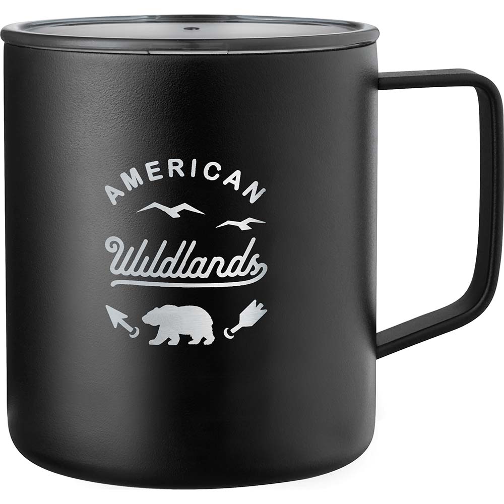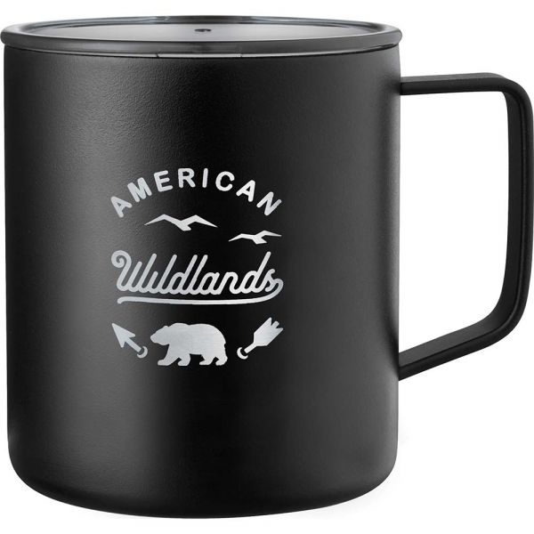 Warm up the campfire ambiance while drinking your tea or coffee with this classic camp cup. Durable, double-wall stainless steel vacuum construction with copper insulation, which allows your beverage to stay cold for 24 hours and hot for at least 6 hours. The construction also prevents condensation on the outside of the piece. On-trend, durable powder coating. 14oz. Laser engraving silver Drinkware will result in a subtle, tone on tone decoration. Material: 18/8 GradeStainlessSteel.