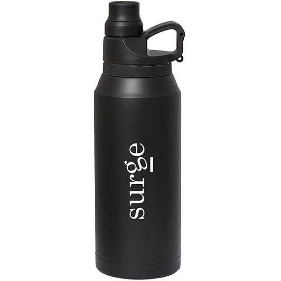 Stainless Steel. Double walled with vacuum insulation. For use with hot and cold beverages. Screw off PP lid with top cap. Wide mouth opening for easy refilling and for ice. You can access the drinking spout by unscrewing the top cap. Top cap is attached so you never lose it. Carry handle attached to lid. Bottle is black with a matte finish. Your choice of coloured Silicone band. BPA free and FDA compliant. Holds up to 945 ml. (32 oz.). Individually retail packaged. Price includes one color, one location imprint. Price includes one colour, one location imprint.