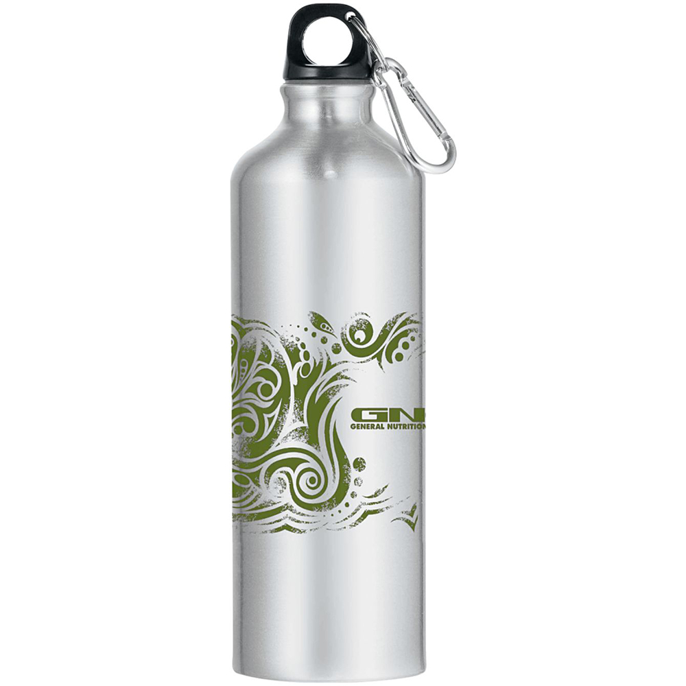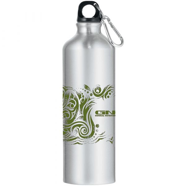 Screw-on lid. Food grade internal liner. Includes matching carabiner. BPA free. 26 oz. Material: Aluminum. Price includes one color, one location imprint.