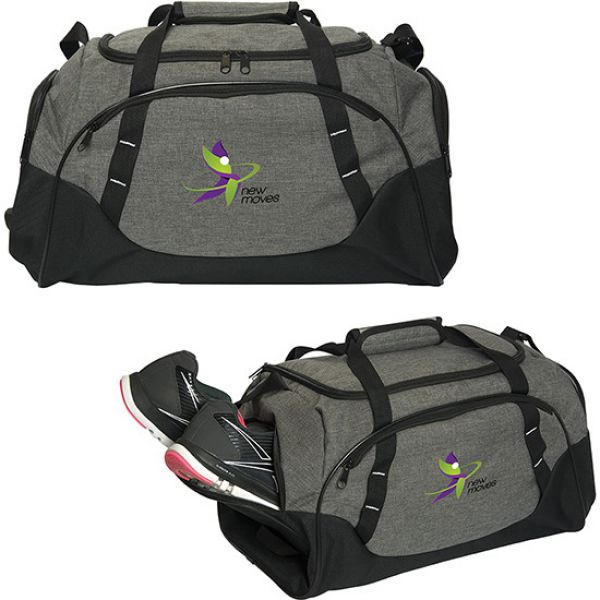 Ripstop and 600D Heathered Polyester. Zippered closure to main compartment. Inside zippered pocket. Front half-moon shaped zippered pocket. Side zippered pocket with mesh. Other side zippered pocket with shoe compartment. Keep your sweaty shoes isolated from the rest of your gear. Two webbed carry handles. Adjustable/non-detachable padded shoulder strap. Packed in a non woven storage bag. Price includes one colour, one location imprint.