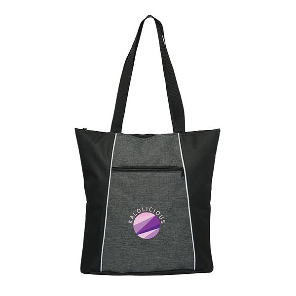 600D Polyester with two-tone Heathered 600D PVC. Top zippered closure to spacious main area. Two reinforced webbed handles/shoulder straps. Front zippered pocket. All bags have white piping.