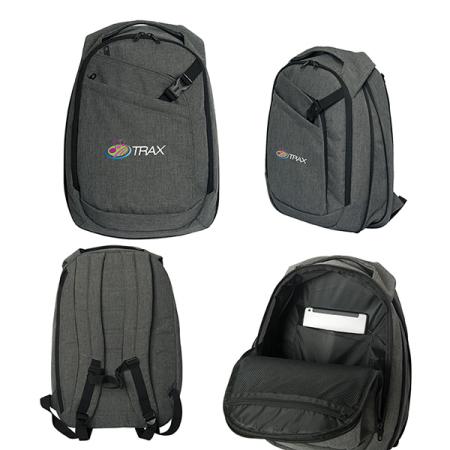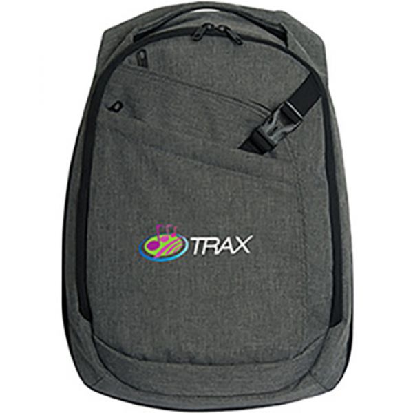 600D Heathered Polyester. Main padded compartment with double zippers. Inside padded mesh sleeve for your tablet up to 8" and mesh zippered pocket. Back padded zippered laptop compartment for laptops up to 15.5". Two front diagonal zippered pockets. Unique reinforced self-material carry handle. Bottom gussets expands an extra 3 inches. Airmesh padded adjustable shoulder strap with safety buckle. Holds up to 20 litres. Packed in a non woven storage bag. Tons of space for all of your tech gadgets. Contents not included. Price includes one colour, one location imprint.