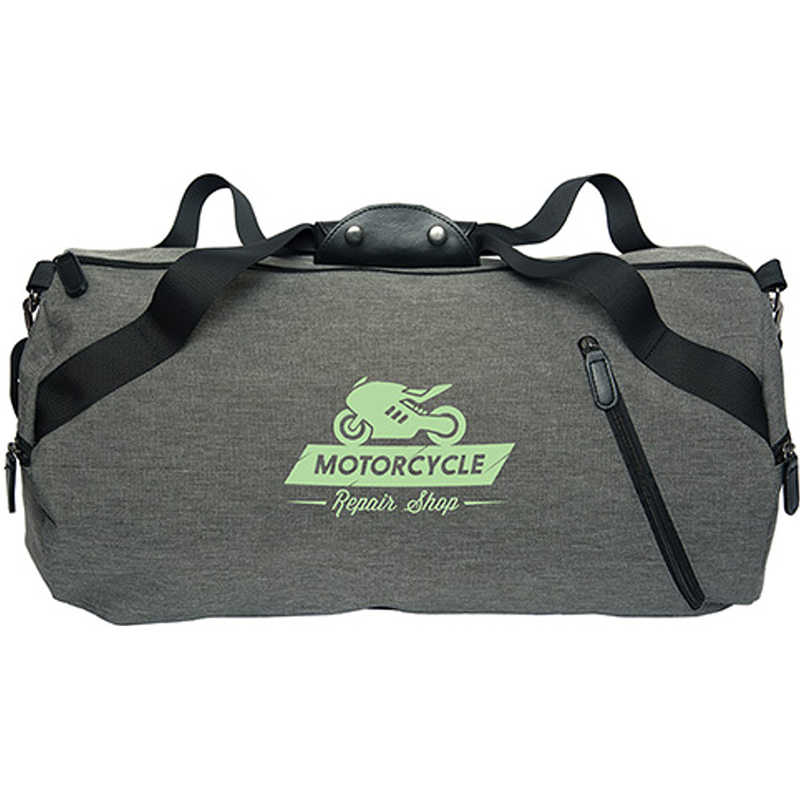 Heathered 300D PVC. 190T PU liner. Classic roll design. Zippered closure to main compartment. Inside valuables zippered pocket. Slanted front zippered pocket. Two zippered pockets on side gussets. Adjustable/detachable padded black PP webbed shoulder strap with heavy-duty clips and rings. Reinforced carry handles with black PVC hand grip with button closure. #5 Nylon zipper closure with Black PVC pull. Packed in a non woven storage bag. Price includes one colour, one location imprint.