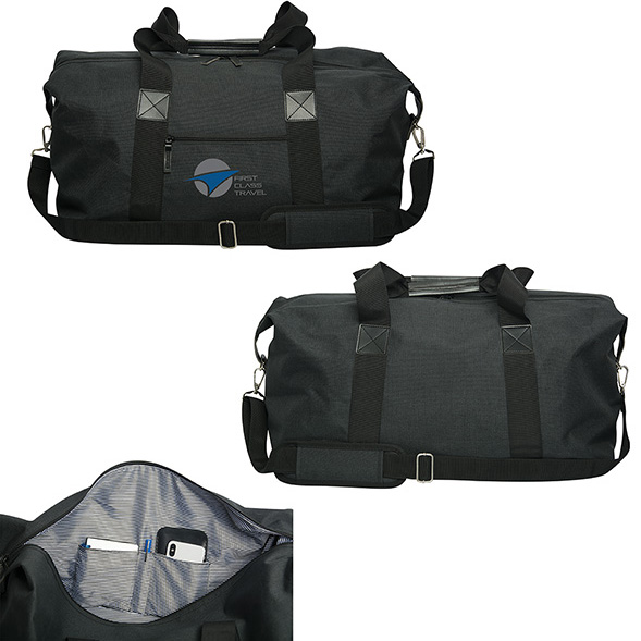 Two-tone heathered 600D PVC. Double zippers to main compartment. Inner black and white striped liner. Webbed carry handles with PU hand grip. Adjustable/detachable padded shoulder strap. Inside organizer pockets. Metal silver hardware. Hard bottom board. Packed in a non woven storage bag. The perfect weekend getaway bag. Contents not included. Price includes one colour, one location imprint.