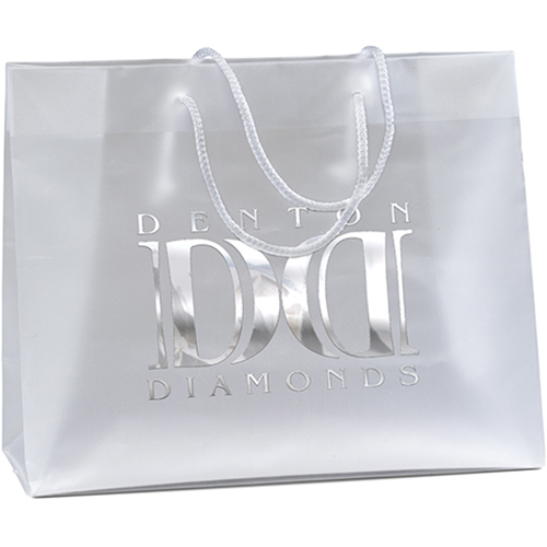 This elegant hi-density 4.0 mil frosted plastic bag features 16"-long macramé handles, reinforced fold-over top, and cardboard bottom insert. Price includes foil stamp.