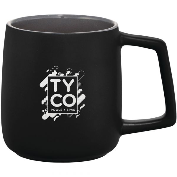 Ceramic mug with smooth, matte outer wall and gray colored, high-gloss inner wall. Choose between color imprinting or our cutting edge, dishwasher safe laser decorating method. Leed's exclusive. 14oz. Material: Ceramic. Price includes one color, one location imprint.