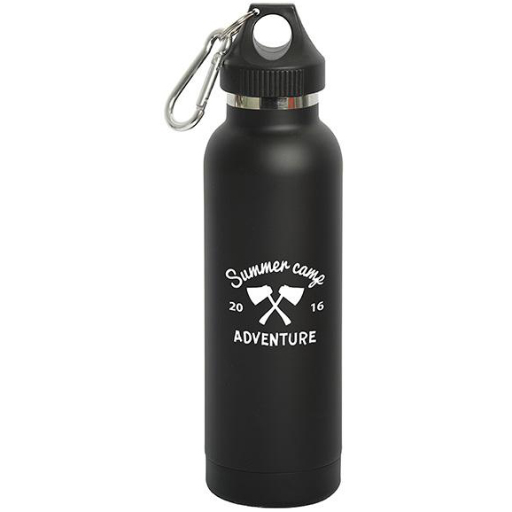 18/8 Stainless Steel interior and 18/0 Stainless Steel matte finish exterior. Large wide mouth opening makes for easy drinking. You can also use the wide opening to add ice and for easy cleaning. Double walled vacuum insulation. PP screw on/off cap. Silver carabiner. Use for hot and cold beverages. Holds up to 500 ml. (17 oz.). BPA free and FDA compliant. Price includes one colour, one location imprint.