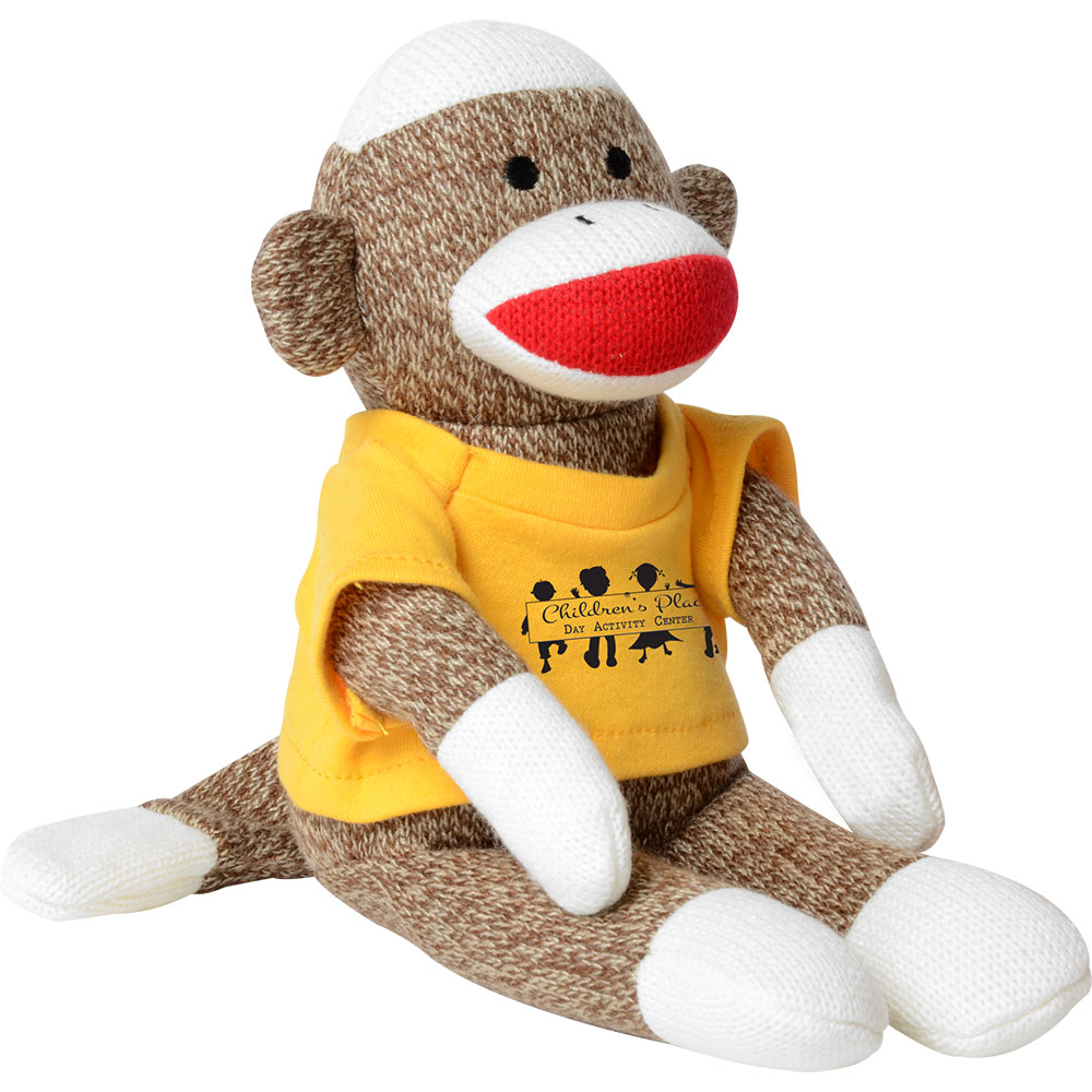 The Sock Monkey is a soft, knitted fabric toy rated safe for all ages and comes with a small T-shirt or bandana. Soft knitted fabric. CPSIA rated for ages 0+. Small T-Shirt or Bandana. Embroidered eyes. Price includes one colour, one location imprint.
