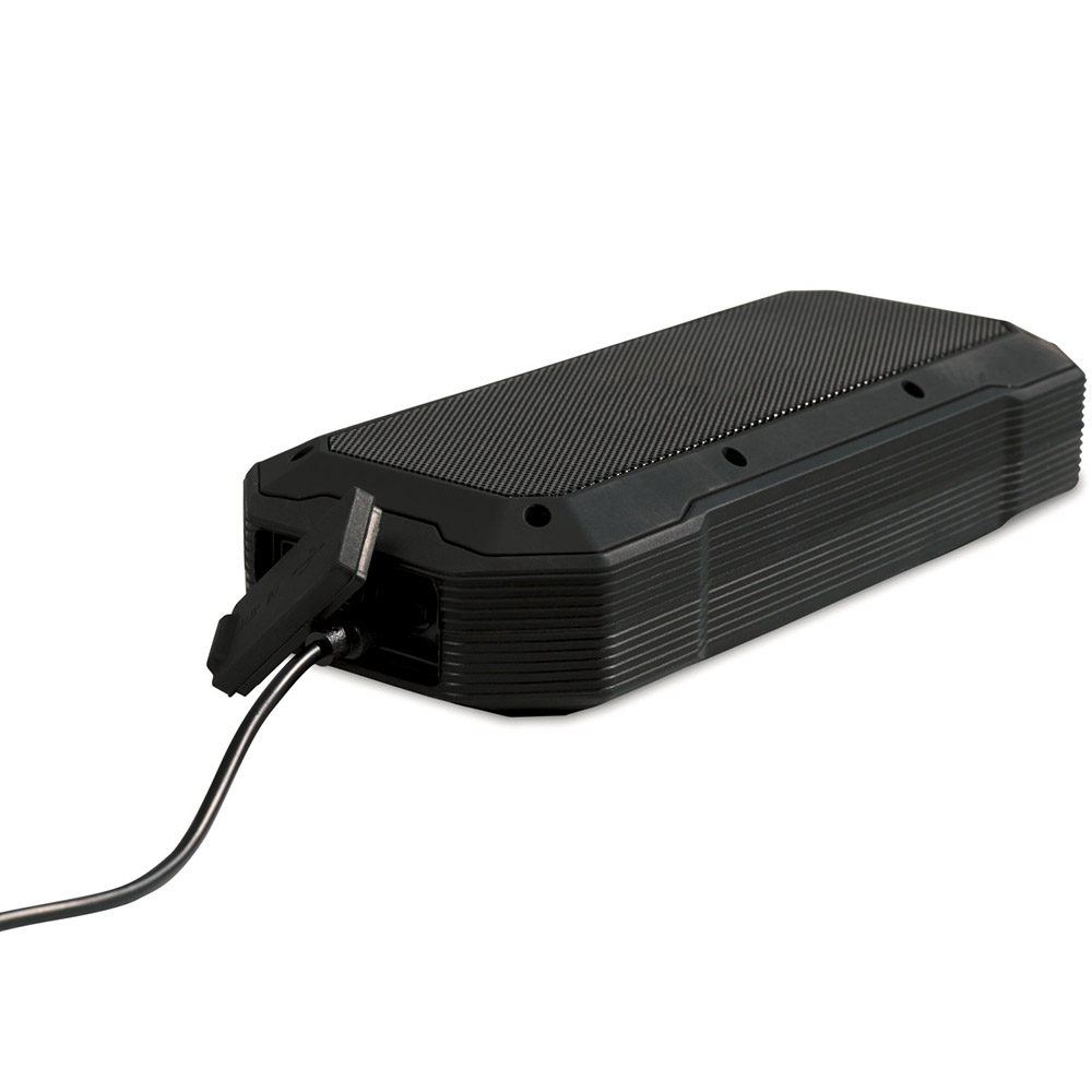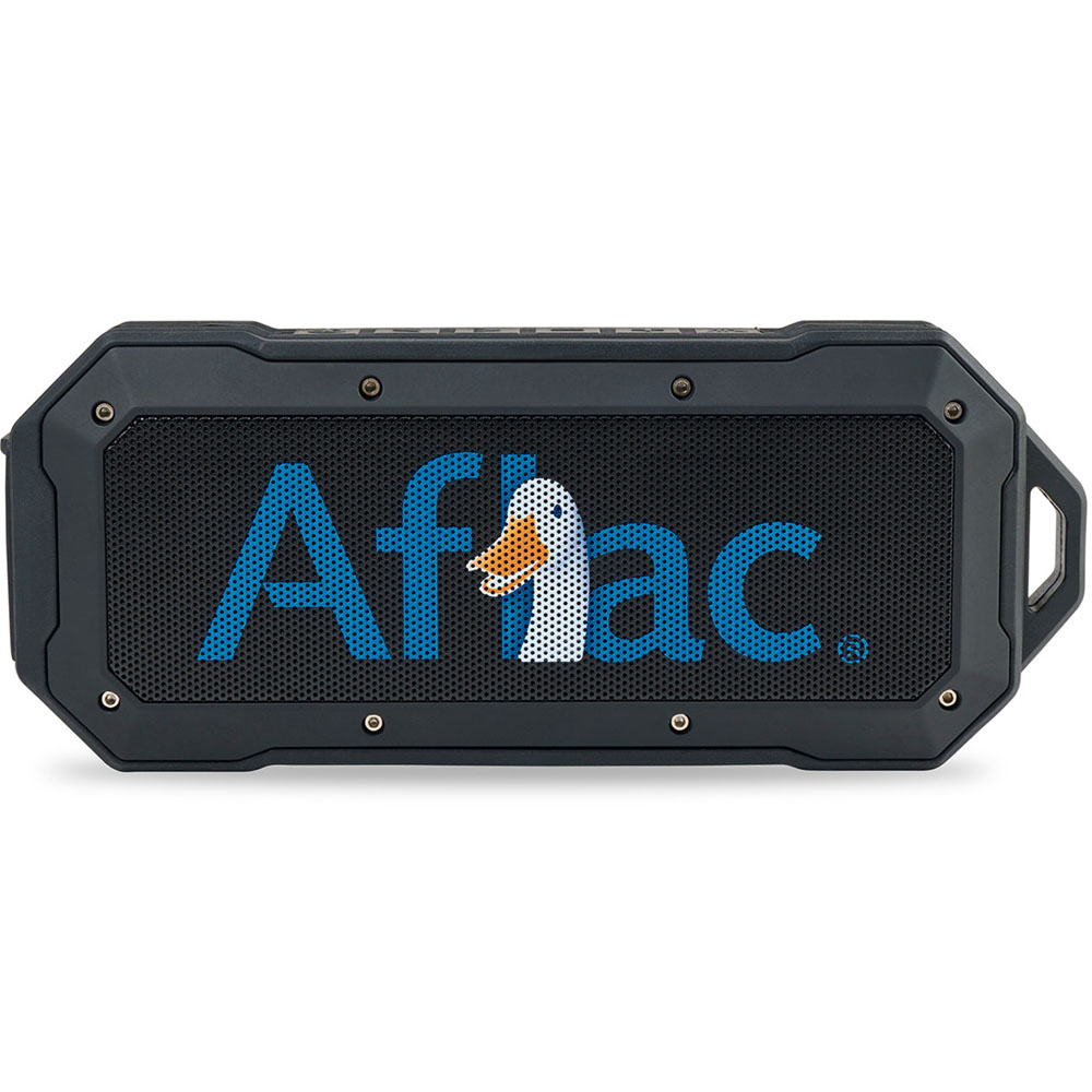 Materials:ABS, Silicone, Metal mesh. Strong magnets make it easy to attach to golf carts, beach and camping tents, and other outdoor spaces. Protection and non-skid feature from built-in silicone around corners and sides. IPX-6 waterproof protection against water splashes. Built-in microphone. Operating distance of up to 33 feet. Supports audio playback from a 3.5mm auxiliary cable. Charging time: approximately 3 hours. Playback time: approximately 3 hours at 60% volume. Max output power: 5 watts. USB Charging cable included. Includes Lithium battery. Gift box dimensions: 8.5"L x 3.3"H x 1.6" W. PVC free. Price includes full colour imprint.
