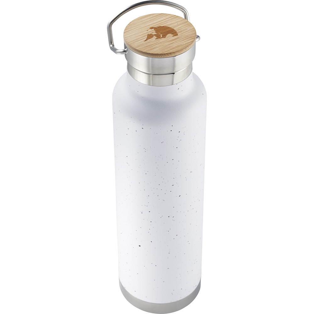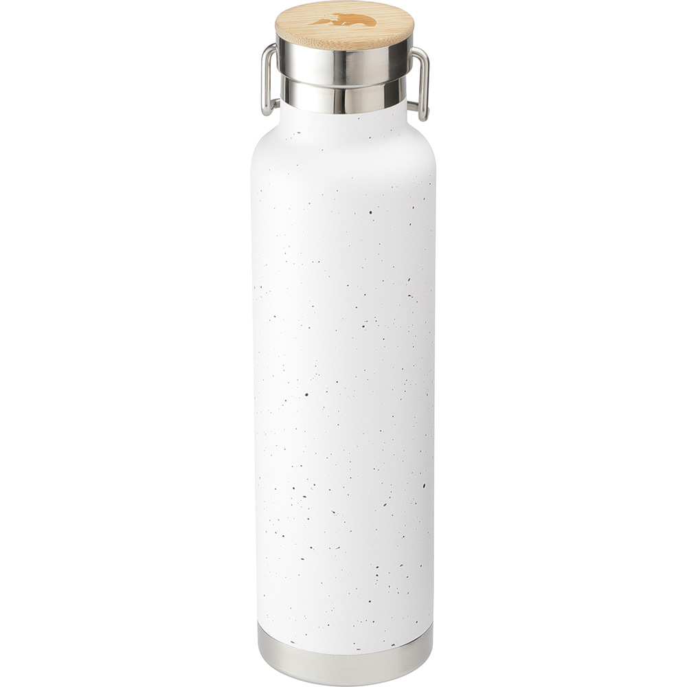 The Speckled Thor Copper Vacuum Insulated Bottle 22oz features durable, double-wall stainless steel vacuum construction with copper insulation, which allows your beverage to stay cold for 48 hours and hot for at least 12 hours. The construction also prevents condensation on the outside of the bottle. Comes complete with the on-trend, durable speckled powder coating and a stainless steel screw-on, spill resistant lid with the natural bamboo top and a durable stainless steel hand loop. It features a wide opening for comfortable filling and pouring. Perfect for ice cubes and fits most standard car cup holders. Material: 18/8 GradeStainlessSteel. Price includes one color, one location imprint.
