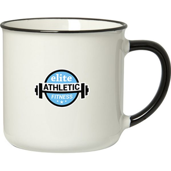 Stoneware. All colours have a glossy white exterior. Your choice of coloured glossy rim and handle. Holds up to 350 ml. (12 oz.). Microwave safe and dishwasher safe. FDA compliant. Price includes one colour, one location imprint.