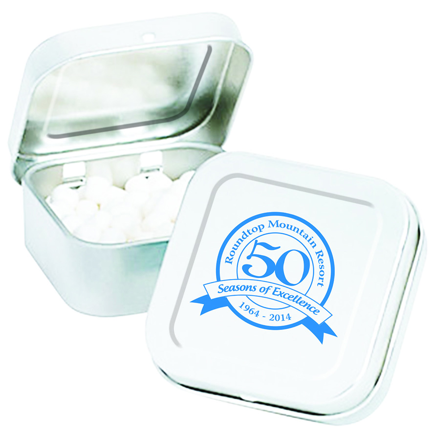 Stay fresh after every meal with our square mints. They come contained in a small tin. The lid of the container will feature your pad printed logo so that anyone who gets this will know that you always have their back. This is a great souvenir for restaurants or candy stores. Stock up on this pack for your place of business and get your brand the attention it deserves! Available In: Silver, Gold, Black, White .*Peppermint only. *Mint Tins are recylclable and shrink wrapped for your safety. Price includes one colour, one location imprint.
