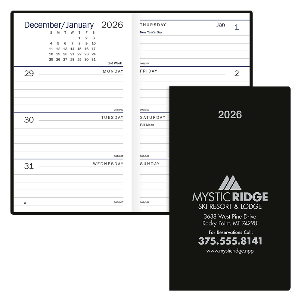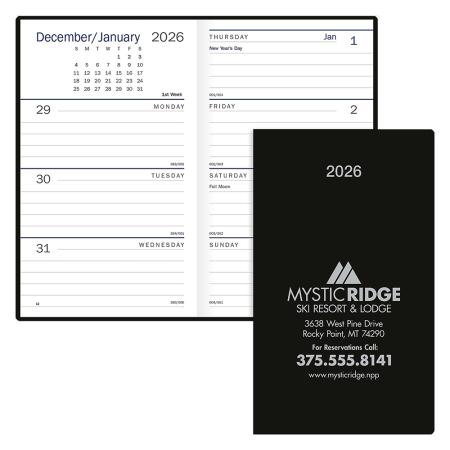 This convenient planner is a perfect thank-you for customers. One week is shown on each two-page spread. Complete this handy planner with an optional address, phone and fax index. "2010" optional on front cover for additional charge. Price includes one colour imprint.