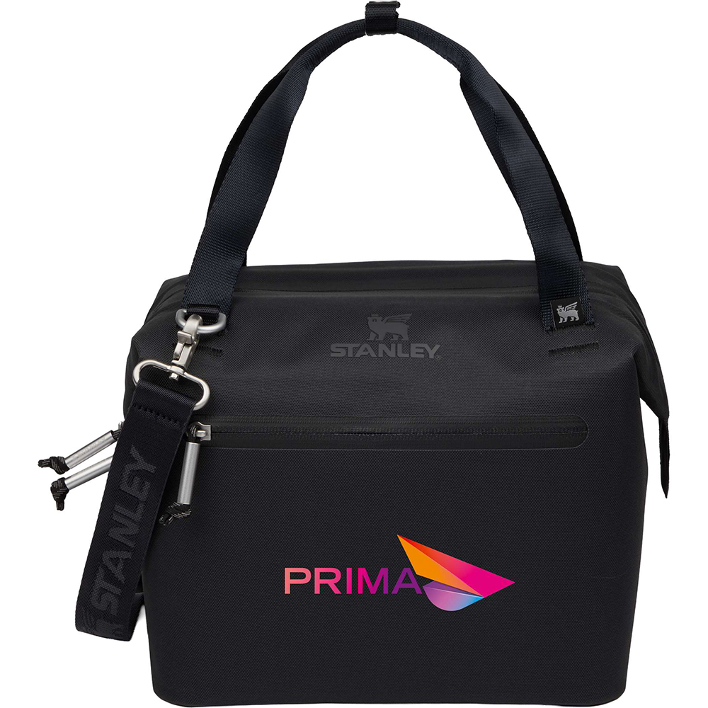 The Stanley All Day Julienne Mini 10 Can Cooler is made from 100% recycled polyester to make dining outside more sustainable. These vibrant coolers with contrast details, and a patterned winged bear liner, hold all you need for picnic dates, city hikes, and weeknights with friends. Head outside to soak up the fun and recharge. With a 10-can storage capacity, the All Day Julienne Mini Cooler keeps your goods nice and cool for 12 hours. The unique "doctor's bag" hinge top pops open to help with unpacking. Load up with reusable ice packs, pop it shut and the sturdy zipper keeps things safely stored. The snap-top handles have a comfortable grip, while a zippered pocket protects your valuables. There's also the option to attach the strap to sling the cooler over your shoulder. From acai bowls to charcuterie, sparkling beverages and wine are ready to be enjoyed. Don't forget to pack all your favorite snacks and drinks in Stanley style. Key Features: Capacity - 10 Can | 7.4 QT | 7.0 L. Main material: 100% recycled polyester. Hinge-top zip opening. Easy-carry top handle. Winged bear liner. Shoulder strap included (145.5 cm - fully extended). Winged bear snap-lock closure. Front zip pocket. Price includes full colour imprint.