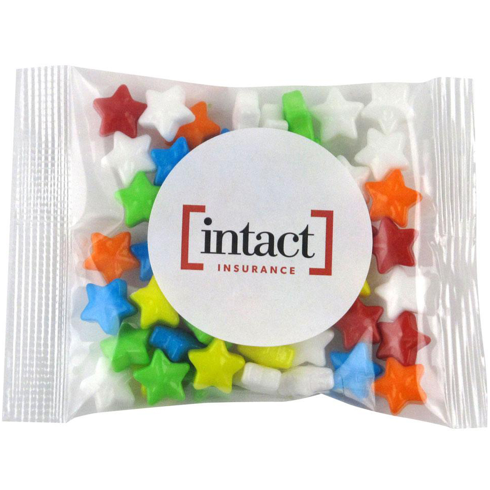 Your customers will love the colorful and tasty appeal of this 1 oz. Starzmania goody bag. This non-melt product is a great accessory to handout during parades, tradeshows or any event where you want to give an inexpensive, colorful and delicious treat.