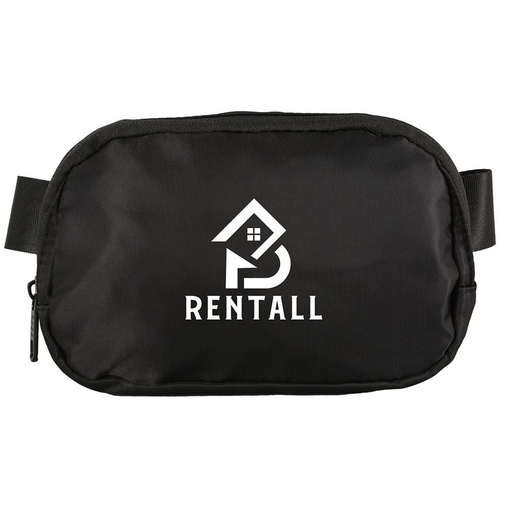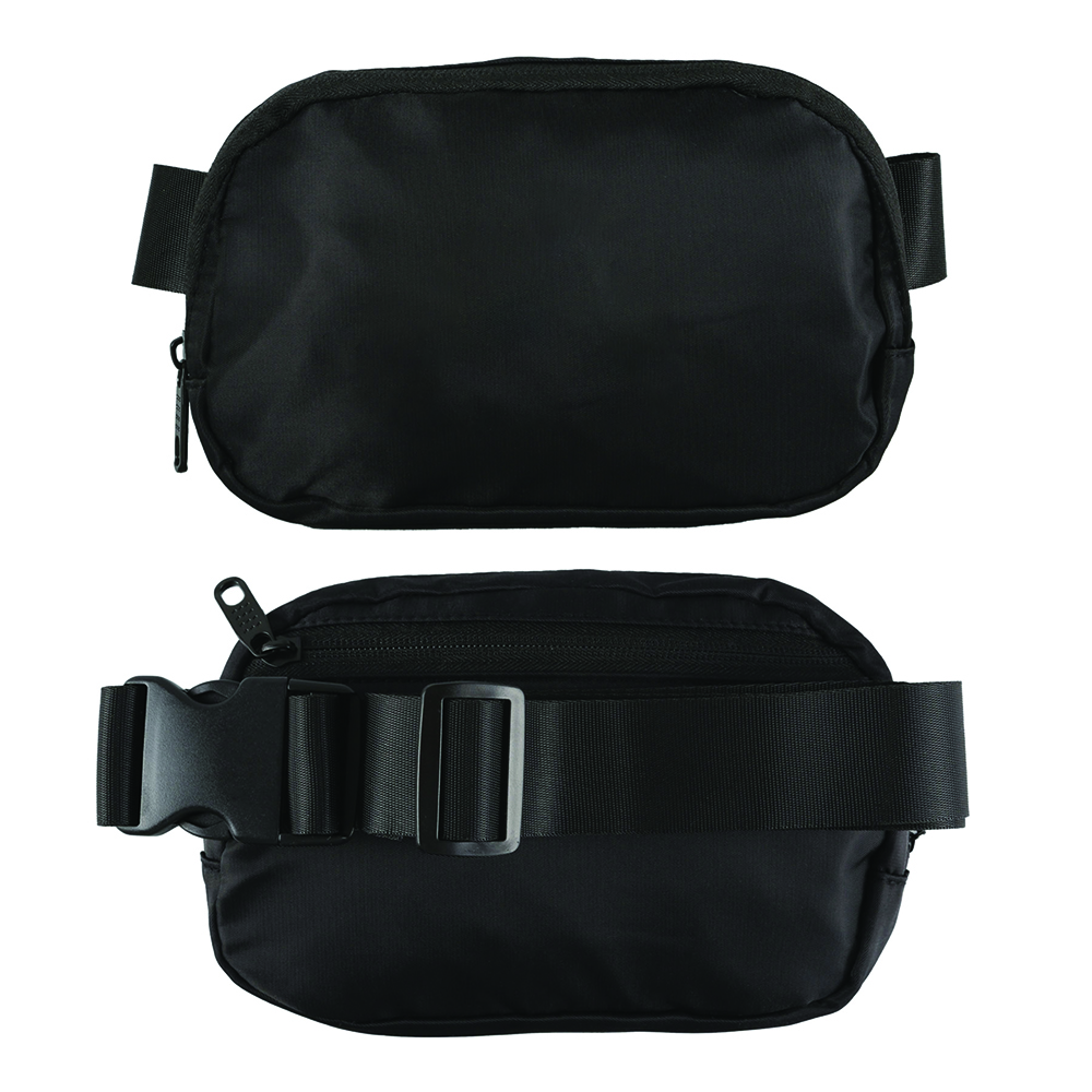 100% Nylon Twill 230D. This belt bag is perfect for your everyday essentials. Belt bag with inner polyester lining. 1.5" high quality smooth Polyester webbing adjustable strap with plastic buckle. Features one inner pocket and one elastic mesh pocket. Main compartment has an elastic mesh organizer keeping things tidy. Back zippered pocket to keep valuables safe. Worn around the waist, across the back, or across the front of your body. Holds up to 1L. Price includes one colour, one location imprint.