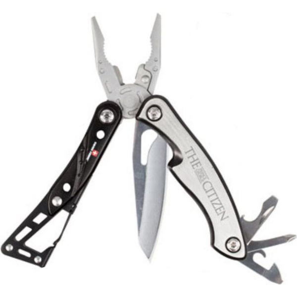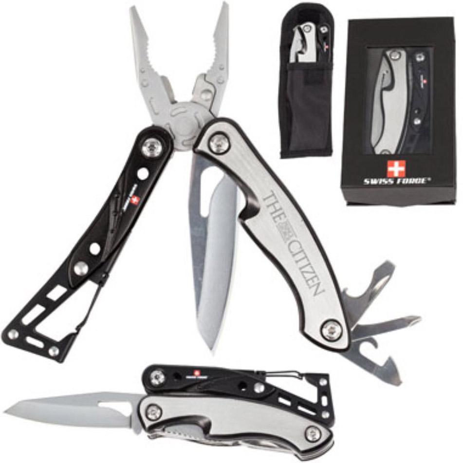 Black anodized stainless steeltools include: 2” blade, wire cutter, needle nose pliers, pliers, can opener/ line blade, slot screwdriver and Philips screwdriver. Carabineer clip makes it easy to take anywhere. The ultimate utility tool for the handy man. Superior stainless steel. Folds up for convenience and easy portable storage. Includes belt loop nylon pouch. Packaged in stylish Swiss Force EVA insert gift box. Price includes laser engraving.