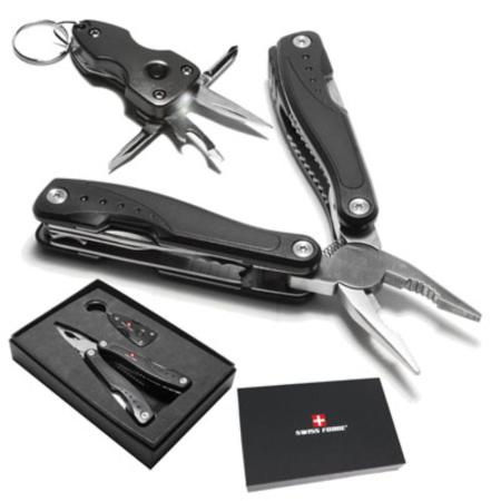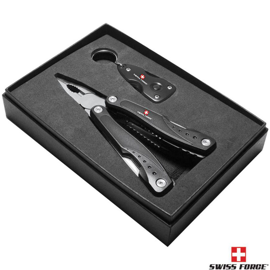 The ultimate essential tool kit. Set of 2 Swiss Force stainless steel multi-tools. Packaged in Swiss Force EVA insert gift box. Includes 14 function, foldable multi-tool with belt loop, nylon pouch. Includes 4 function mini-tool with light & key ring. Price includes laser engraving.