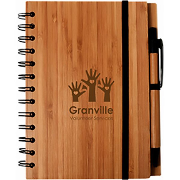 Spiral bound Bamboo cover. Includes 70 sheets of lined natural coloured 70 gsm recycled paper. Black elastic closure cord and pen loop. Includes matching Bamboo & ABS pen. Bamboo is an eco-friendly and sustainable material. Sturdy cover for writing without a hard surface. Price includes one colour, one location imprint.