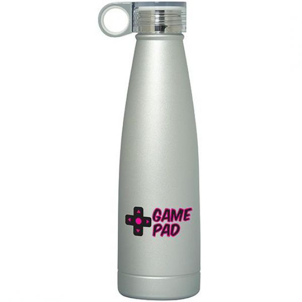 Stainless Steel. Single walled with matte glitter finish. Screw on clear Acrylic lid with built-in ring handle. Holds up to 750 ml. (25 oz.). BPA free and FDA compliant. For use with cold beverages. Price includes one colour, one location imprint.