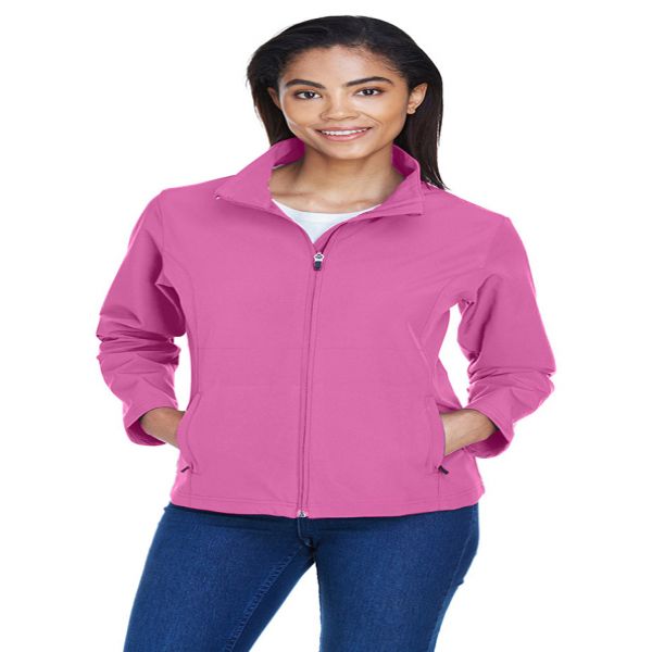 Fabric: 8.8 oz., 94% polyester, 6% spandex three-layer breathable soft shell. Waterproof and windproof membrane with 3,000 mm waterproof rating and 1,000 g breathability. Wind- and water-resistant. Feature: Matching chin guard. Center front reverse coil zipper. Lower zippered pockets. Price includes embroidery.