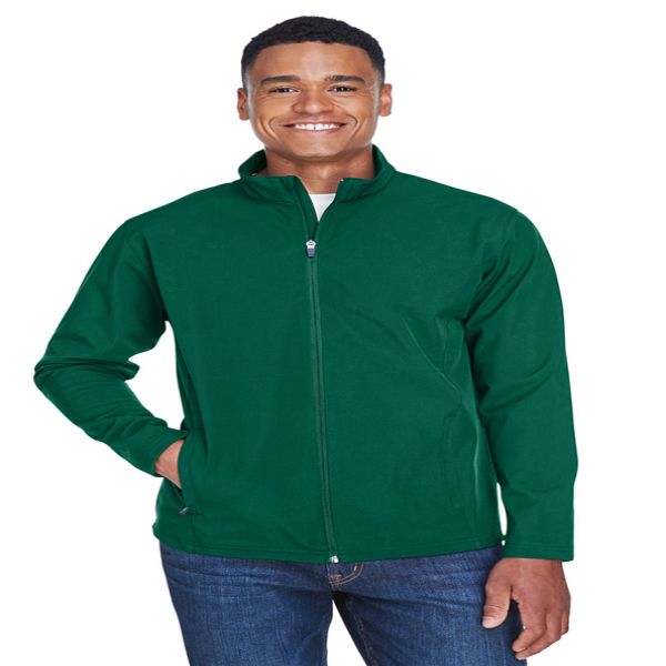 Fabric: 8.8 oz., 96% polyester, 4% spandex three-layer breathable soft shell. Wind- and water-resistant. 3,000 mm waterproof rating. 1,000 g breathability rating. Feature: Center front dyed-to-match reverse coil zipper with semi-autolock rubber pull tab and chin guard. Zippered front welt pockets. Open hem cuffs. Double-needle stitching at hem and cuffs. Open hem with drop back bottom. Price includes embroidery.