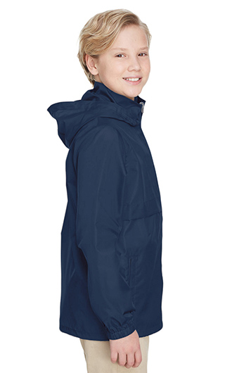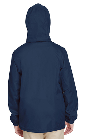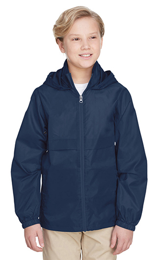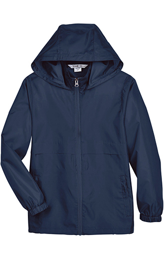 Fabric: 1.7 oz/yd2 /58 gsm, 100% polyester taffeta. Water-resistant finish. Feature: Center front coil zipper with autolock slider. Lower front concealed zippered pockets. Elasticized cuffs. Rollaway hood.
