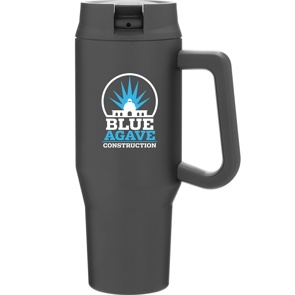 32 oz double wall 18/8 stainless steel thermal mug with copper vacuum insulation, threaded lid, matching flip-up spout, soft straw, wide handle, and powder coated finish