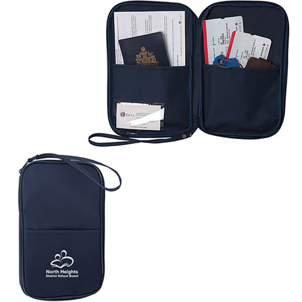 600D Polyester. Two interior pockets and an interior card slot. Keep your tickets, boarding pass, passport and other documents organized while travelling. Front open slash pocket. Classic styling with zippered closure. Get your logo noticed all around the world. Store everything conveniently in one location. Price includes one colour, one location imprint.