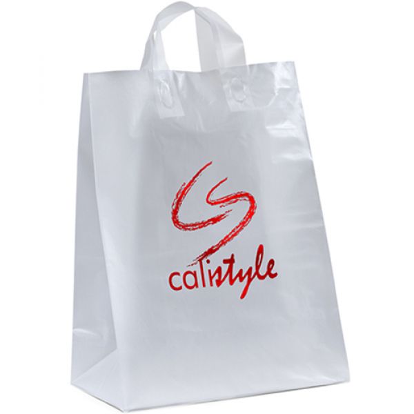 This hi-density 3.5 mil frosted plastic bag offers upscale, retail-style packaging. Features matching fused loop handles and cardboard bottom insert. Price includes foil stamp.
