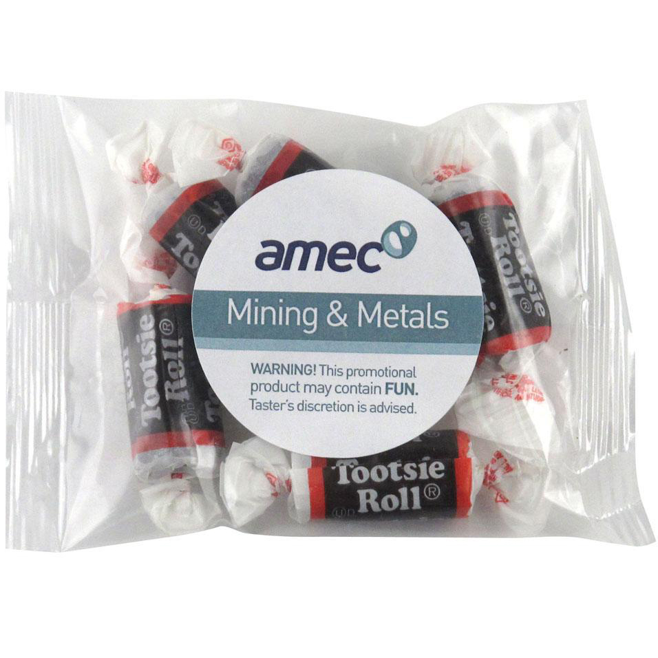 1oz. Tootsie Rolls (R) Goody Bag. Perfect for parades, trade shows or any event where you want to give an inexpensive, colorful and delicious treat. Imprint is on a Label, Direct printing is available please call for details. Kosher Certified.