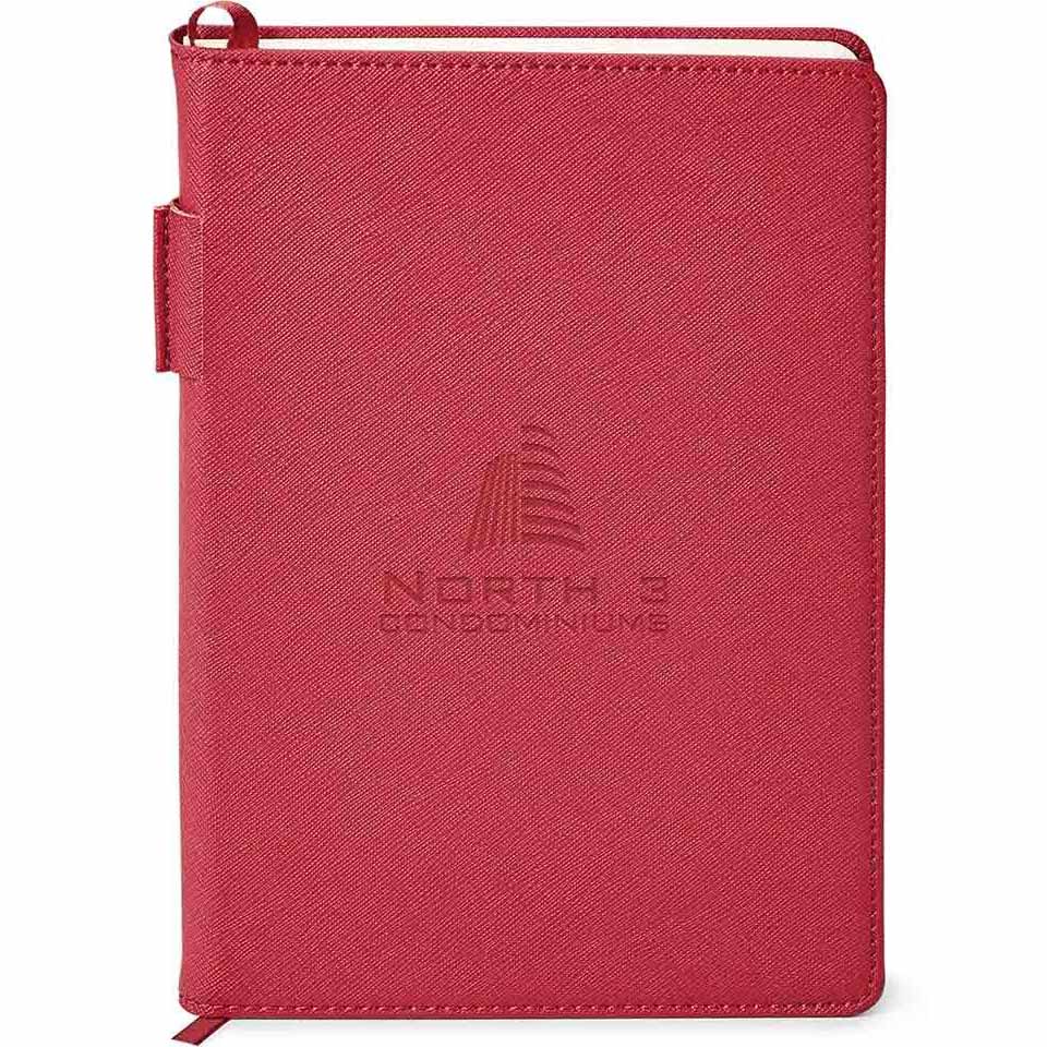 Standard: Bulk. Take time to keep track of your dreams and ideas in the Toscano hard cover perfect bound journal. Its diamond-textured genuine leather cover encloses 192 perforated lined FSC ivory pages and using the colour matched ribbon bookmark, finding the dated page you are looking for is simple. The unique colour-match pen loop, discreetly integrated into the spine of the journal, expands as needed when holding your pen and then retracts, showing why the Toscano journal is exactly what a Spector & Co. Original should be. NOTE: Laser touch branding method available on blue and black items only. Price includes debossing.