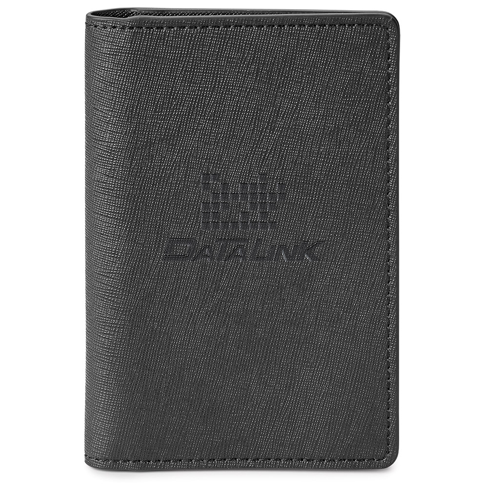 Standard: Black 2-piece gift box. The quality of the Toscano genuine leather passport holder is no secret, but its RFID protection ensures that the details of your passport are kept secure. With 4 inner card slots and a 16-page saddle stitched black cover booklet included, this Spector & Co. Original travel companion is a great backdrop for your logo. NOTE: Laser touch branding method available on blue and black items only. Price includes debossing.