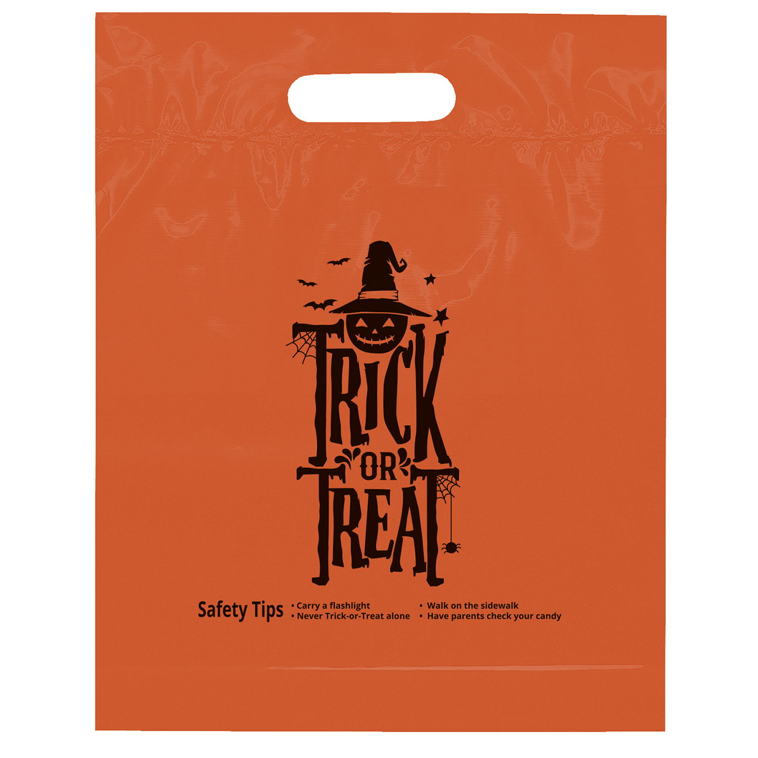 This 2.5 mil. white plastic bag features fold-over die cut handles and bottom gusset. Stock design with safety tips printed on one side. Add your custom imprint to the second side.