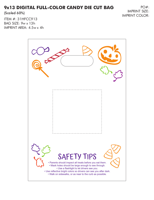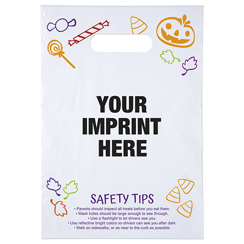 Model: 31HFCC913 Trick or Treat Product Description New digital full-color Halloween stock designs are printed on both sides of this 2.0 mil white plastic bag. This recyclable bag features non-reinforced die cut handles and no gusset. Add your custom imprint to the second side above the safety tips. Size: 15"h x 12"w x 3"d Imprint Area: 4"h x 4.5"w Request A Virtual Proof Choose Quantity View Price Breaks Quantity Price 250 $1.63 500 $1.02 1000 $0.93 3000 $0.86 Enter quantity or drag slider. Minimum quantity is 250. Quantity: Price Each $1.63 Setup Charge: $0.00 Subtotal $407.50 Savings: $ over minimum qty pricing Choose Your Quantity Quantity Price 250 $1.63 500 $1.02 1000 $0.93 3000 $0.86 Standard Production Time: 8 business days Select Delivery Date Enter Postal Code Apply Loading... Choose a Shipping Method -- Loading Shipping Prices -- Customize it! Upload Your Art Now Or Send it Later. Select Imprint Colour(s) Back to Edit Product Color And Quantity Where on the item should we print your design? 4.5" x 4" Available print design areas 4.5" x 4" Quantity: 250 Add Your Artwork Add Artwork Add Now Send After Checkout Don’t have artwork? That’s ok! Artwork is not required to start a job. Simply skip this step and email us artwork later (info@rushimprint.ca). If you need assistance with your art, our designers can help with that too! Will I be able to approve my design before it goes into print? Yes! You will receive a digital mock-up of your artwork on this item within a few hours of placing your order. We will send your order into production only after you approve the mock-up. Only Image Aa Only Text Aa Text/Image Contact Us Enter Your Text Choose file Uploading logo. Please wait... Personalize your design by adding text and customizing its shape with a curve. Upload your logo to give it a professional touch, and combine these elements to create a one-of-a-kind design that’s uniquely yours. Open Product Designer Don’t have artwork? That’s ok! Artwork is not required to start a job. Simply skip this step and email us artwork later. If you need assistance with your art, our designers can help with that too! Will I be able to approve my design before it goes into print? Yes! You will receive a digital mock-up of your artwork on this item within a few hours of placing your order. We will send your order into production only after you approve the mock-up. Free art proof will be emailed with every order within one business day Total (loading...) qty x Set Up Shipping Cost Rush Charge Custom Fields Hazmat Fee Estimate arrival Savings Add to Cart Updating Price...