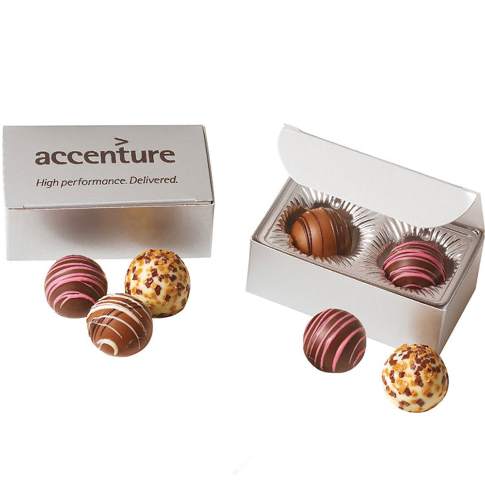 Thank each customer for their continued business during appreciation events or holidays with this sweet treat! The decadent flavor filled truffles sit in a checkered pattern inside this elegant metallic gift box with matching stretch bow. Box is filled with 2 assorted truffle flavors .Imprint the box with your foil stamped logo. Also makes a superb amenity for hotels, spas and upscale boutiques. Price includes one color, one location imprint.
