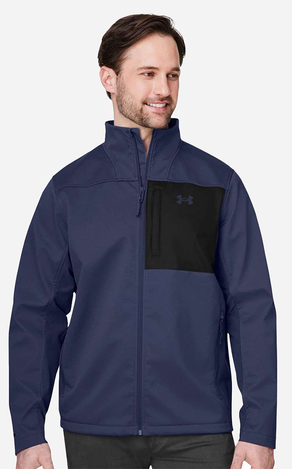 Fabric: 100% polyester. UA Storm technology repels water without sacrificing breathability. Durable, bonded 3-layer softshell material has a quiet outer layer & superior stretch. ColdGear Infrared lining uses a soft, thermo-conductive coating to absorb & retain your body heat. Windproof materials shield you from the elements. Feature: 4-way stretch construction moves better in every direction. Secure, zip hand pockets and chest pocket. Drawcord adjust on bottom hem for a secure, custom fit. Streamlined fit that's not too tight or too loose.