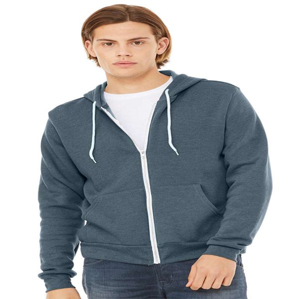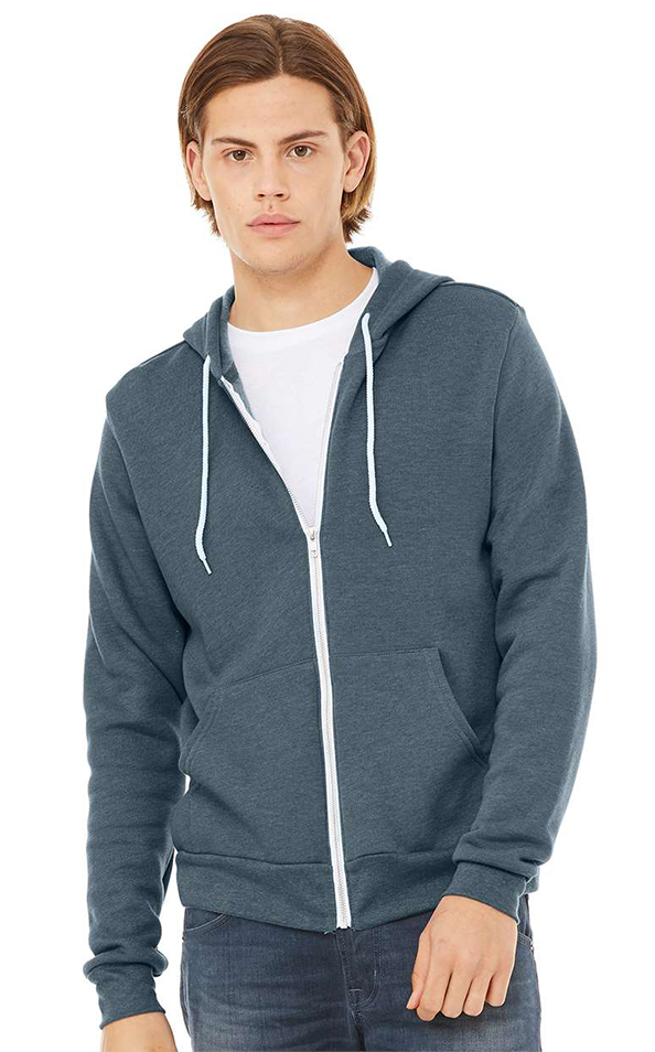 7 oz., 52/48 Airlume combed and ringspun cotton/polyester, 32 singles. Athletic Heather is 90/10 Airlume combed and ringspun cotton/polyester. Navy Heather is 60/40 Airlume combed and ringspun cotton/polyester. Digitals are 100% polyester. Marbles are 85/15 Airlume combed and ringspun cotton/polyester. Neon colors are 60/40 Airlume combed and ringspun cotton/polyester fleece. DTG colors are 70/30 Airlume combed and ringspun cotton/polyester with 100% cotton face. Retail fit. Unisex sizing. White drawcord and zipper tape. YKK metal zipper. Split front pouch pocket. Ribbed cuffs and waistband. Side seams. Tear away label.