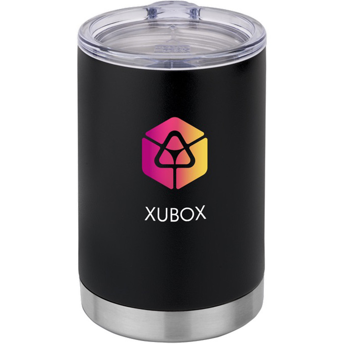 18-8 Stainless Steel dual-walled construction. Vacuum-insulation maintains optimal 6X drinking temperatures. Lead-free in all accessible components. Transitions between poured drink insulated tumbler, 12 oz can cooler, and 12 oz beer bottle cooler. Features 2 attachments: clear screw-on, sip-through lid and a black can/bottle ring. Twist top rubberized ring to hold a standard 12 oz. can or bottle. Fits in most corporate and personal coffee machines. 1-year limited warranty. Price includes full colour imprint.
