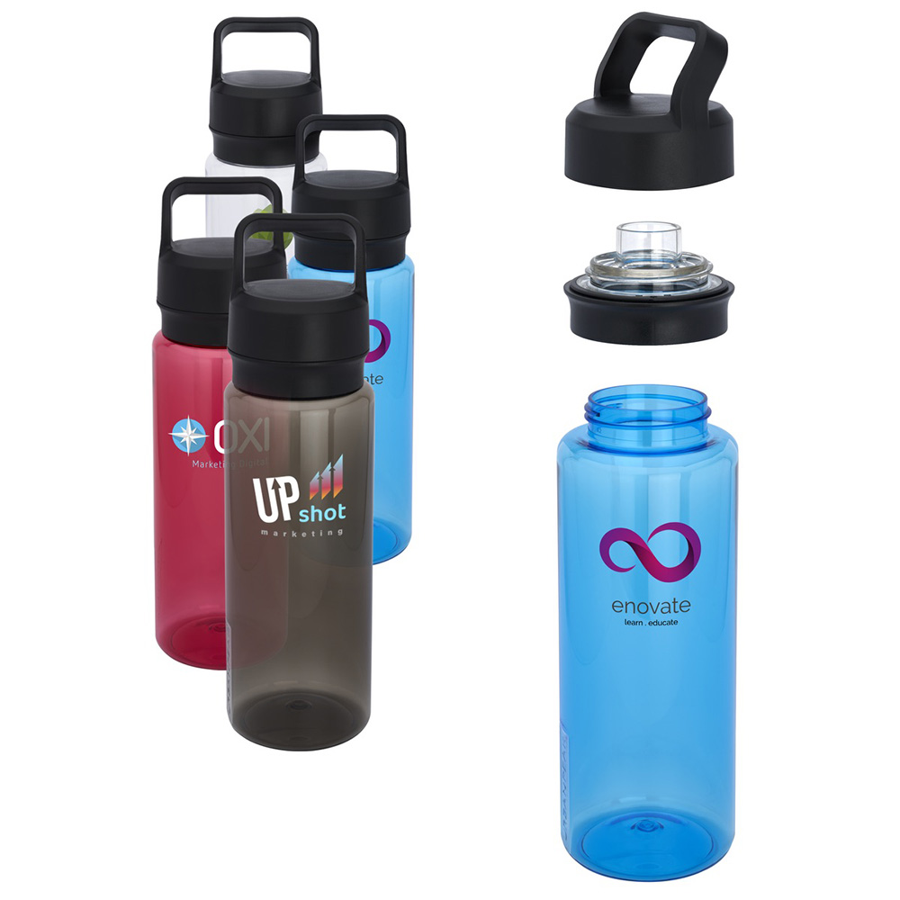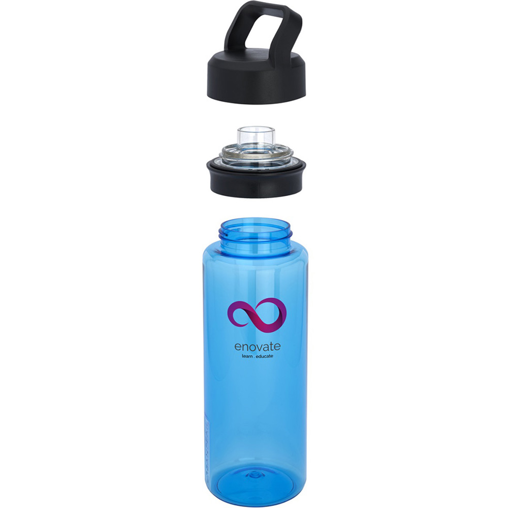 Durable Tritan material water bottle with a dual top carry handle. Single-wall Tritan plastic construction. Tritan material is shatter, stain and odor resistant. Features a leak-proof, screw-on plastic dual top for both wide opening and drinking spout. Lightweight and easy to carry. 1-year limited warranty. BPA Free. Handwash only, not dishwasher safe. Price includes full colour imprint.