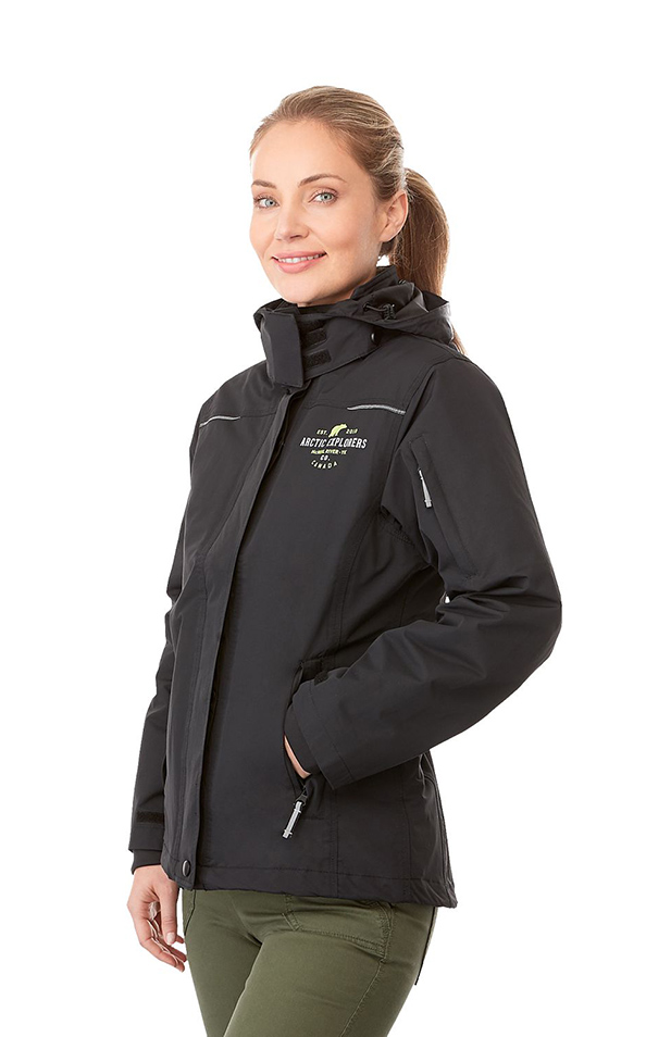 Seam sealed multi-functional 3-in-1 jacket with breathable, water repellant finish features detachable snap-off hood with drawcord and interior cord locks. Fine detailing includes diminishing two-tone reflective piping and triple needle top stitching. Sleeves engineered with adjustable self fabric cuff tabs with hook and loop closure and articulated elbows. With interior system snap tabs for liner add in. Accompanying liner with coverstitch detail features exposed plastic zipper with oxidise dark slider and puller. Lower patch pockets plus interior pocket. System loops at neck and lower sleeves. FABRIC: OUTER SHELL: 100% Nylon taslan with waterproof (5000mm), breathable (3000g/m2) coating and water repellent finish. 145g/m2 (7 oz/linear yd). LINING: 100% Nylon taffeta. 100% Polyester brushed tricot knit pocket bags. DETACHABLE JACKET: 100% Polyester jersey knit with brushed back. 255 g/m2 (12.6 oz/linear yd). DETACHABLE JACKET LINING: 100% Polyester tricot knit sleeves. 100% Nylon taffeta interior pocket. Price includes embroidery.
