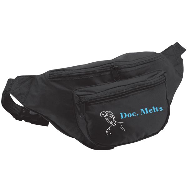 420D Nylon. Three zippered pockets including hidden back compartment. Plastic hardware. Extra long adjustable webbed waist strap. Price includes one colour imprint, one location.