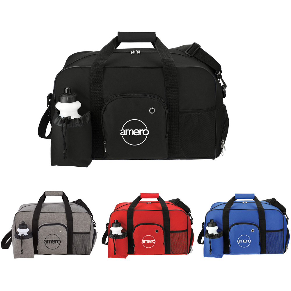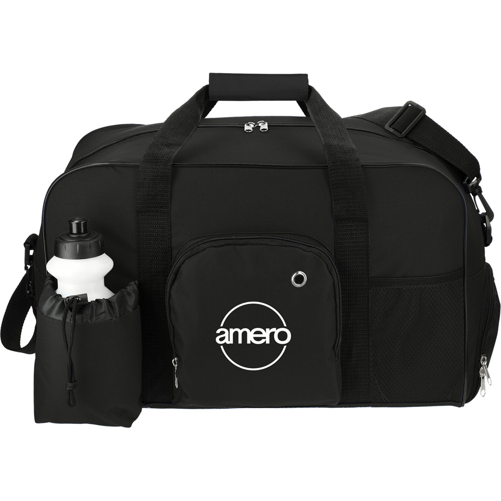 The Weekender 18.5" Deluxe Duffel Bag features a zippered main compartment, zippered front media pocket with earbud port and a front mesh pocket and front pouch with an adjustable drawstring and squeeze-top water bottle (not imprinted). It also includes a zippered side shoe compartment and a secure bottom board for stability. The double 20.5 inch reinforced handles and detachable, adjustable shoulder strap make carrying simple and convenient. Material: 600d PolyCanvas. Price includes one color, one location imprint.